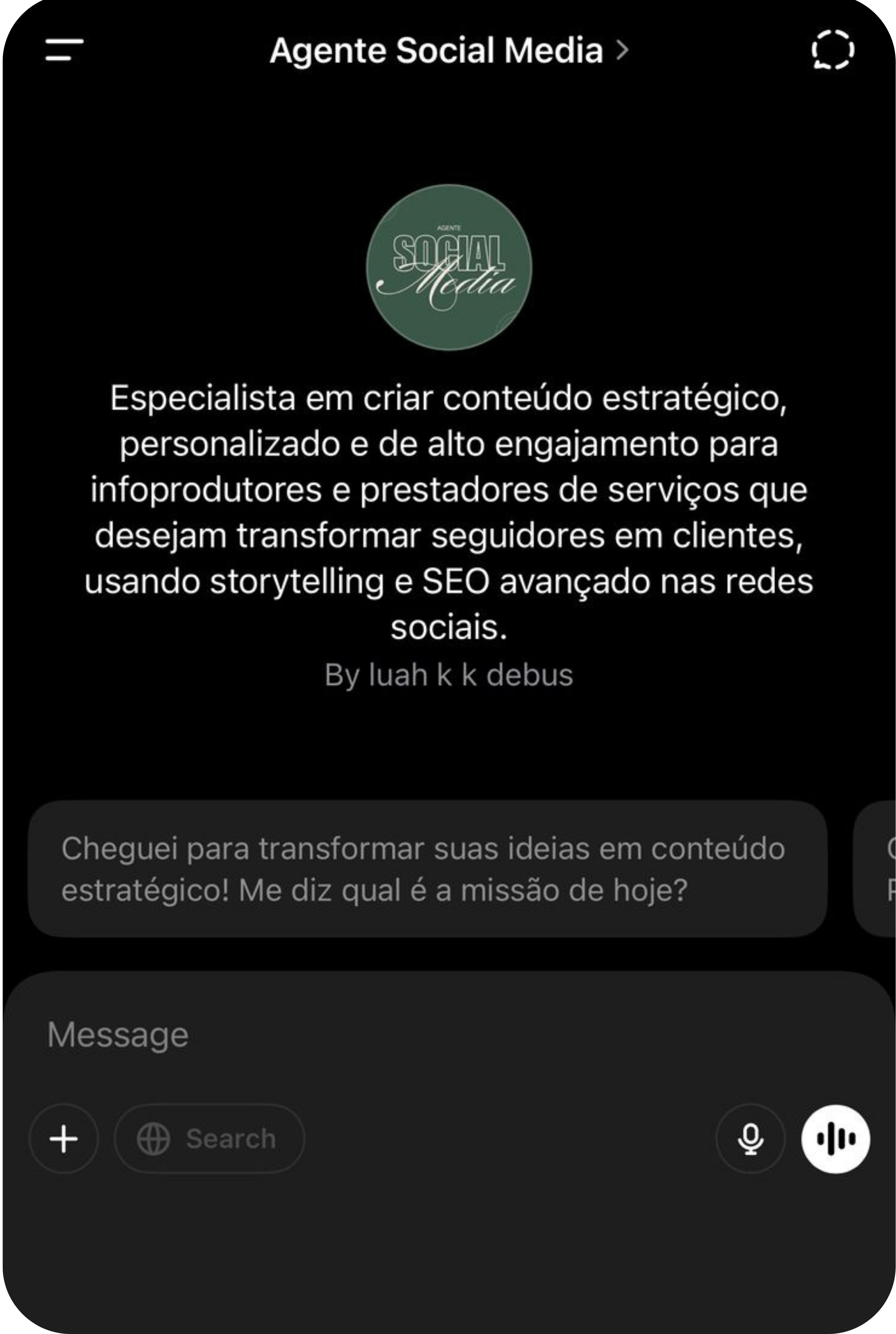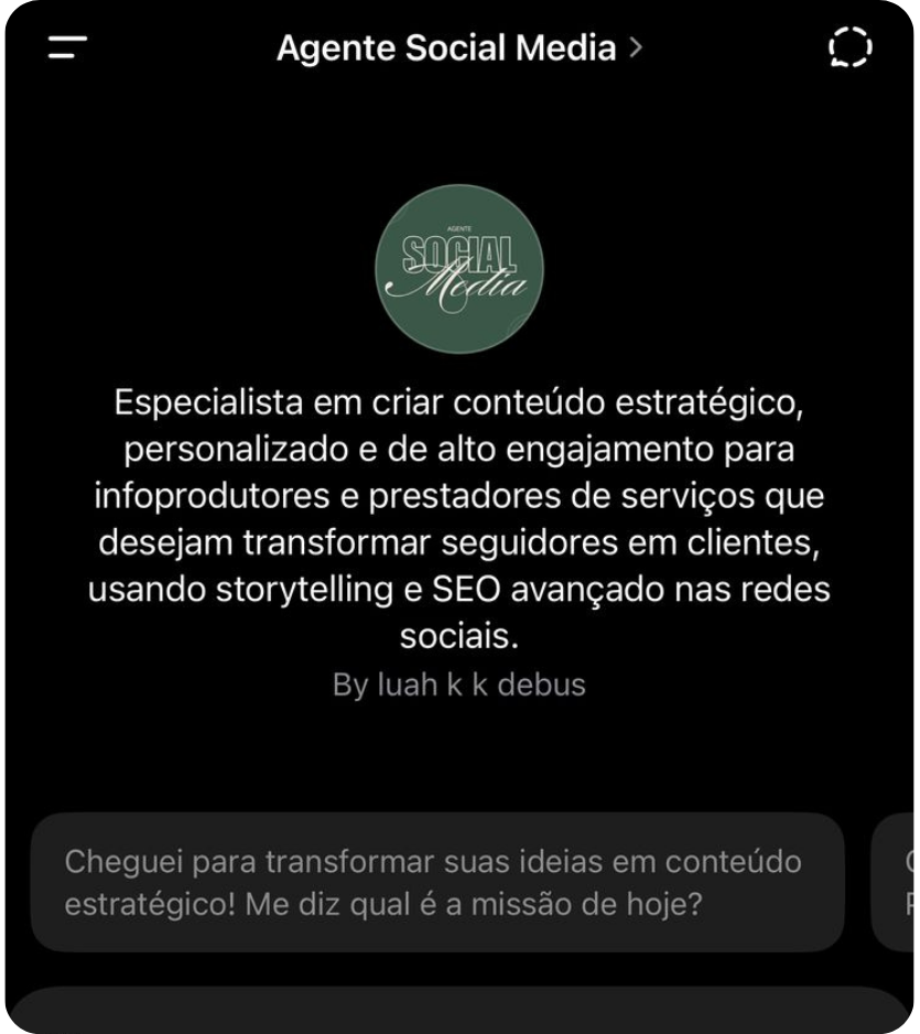 Um assistente GPT treinado que cria conteúdos estratégicos, sugere postagens e ajuda você a gerenciar seu Instagram como um profissional, sem precisar contratar um social media mensalmente.