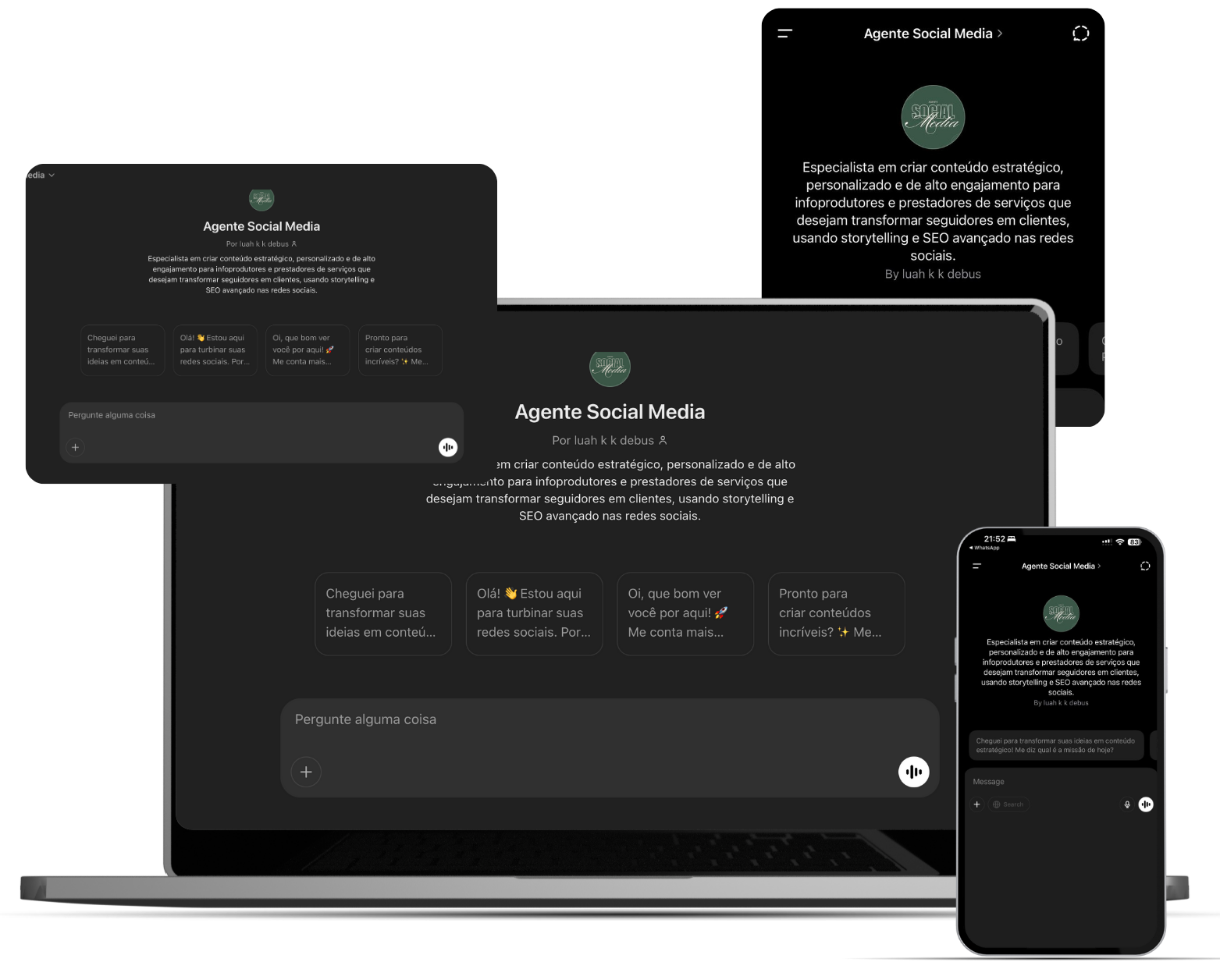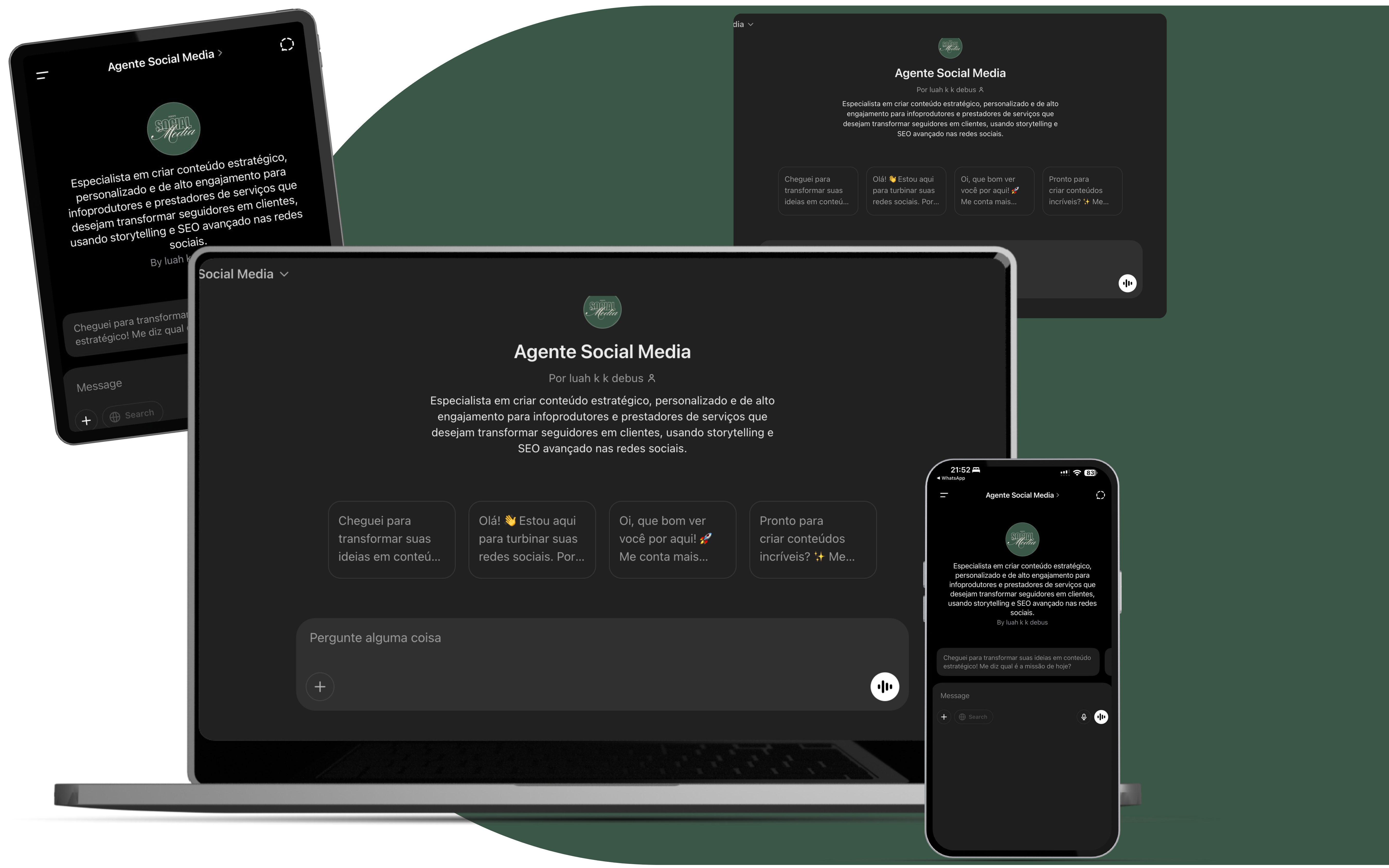 O ChatGPT normal responde de forma genérica, sem foco em estratégias de redes sociais. Já o Agente Social Media é treinado para infoprodutores e prestadores de serviço, entregando conteúdos prontos, planejamento estratégico e minha expertise aplicada.