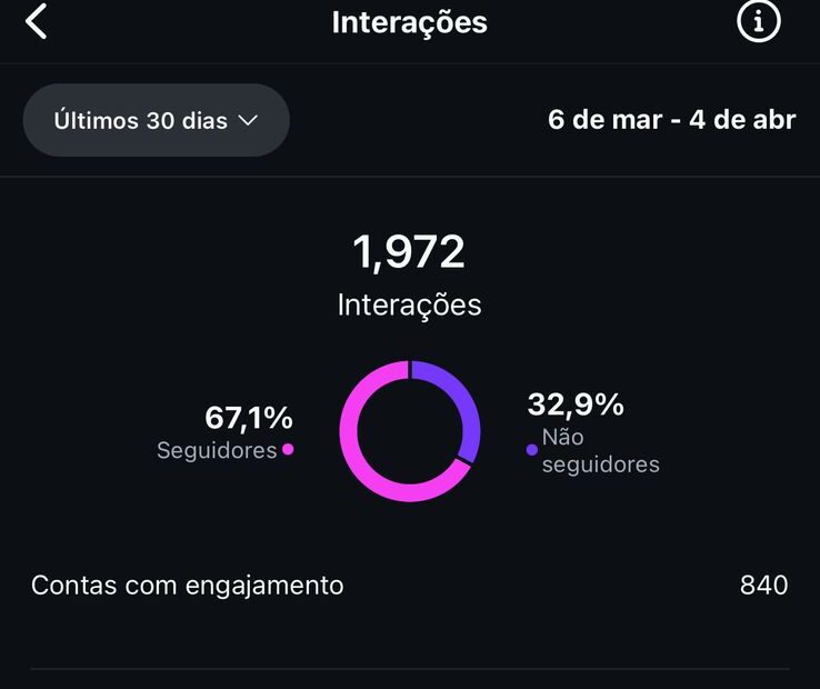 Nos últimos 30 dias, alcançamos 1.972 interações — com um dado poderoso: 67,1% vieram de seguidores. Isso comprova que o conteúdo não só atrai, mas mantém a audiência conectada e engajada, reforçando a construção de uma comunidade sólida em torno da marca.