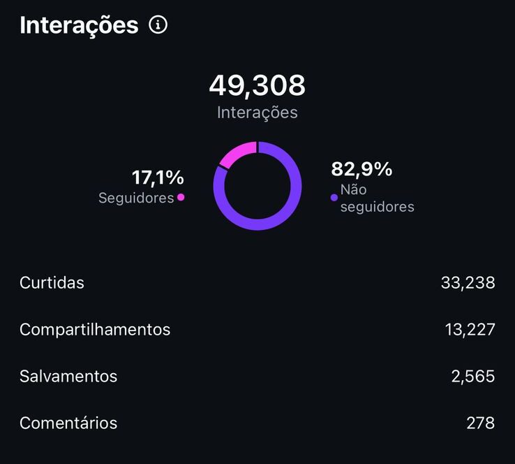 Com mais de 49 mil interações, sendo 82,9% de não seguidores, o conteúdo gerado demonstra alto poder de atração e potencial viral. Foram 33 mil curtidas e 13 mil compartilhamentos, o que comprova uma excelente taxa de engajamento orgânico e uma estratégia que realmente atrai novos públicos.