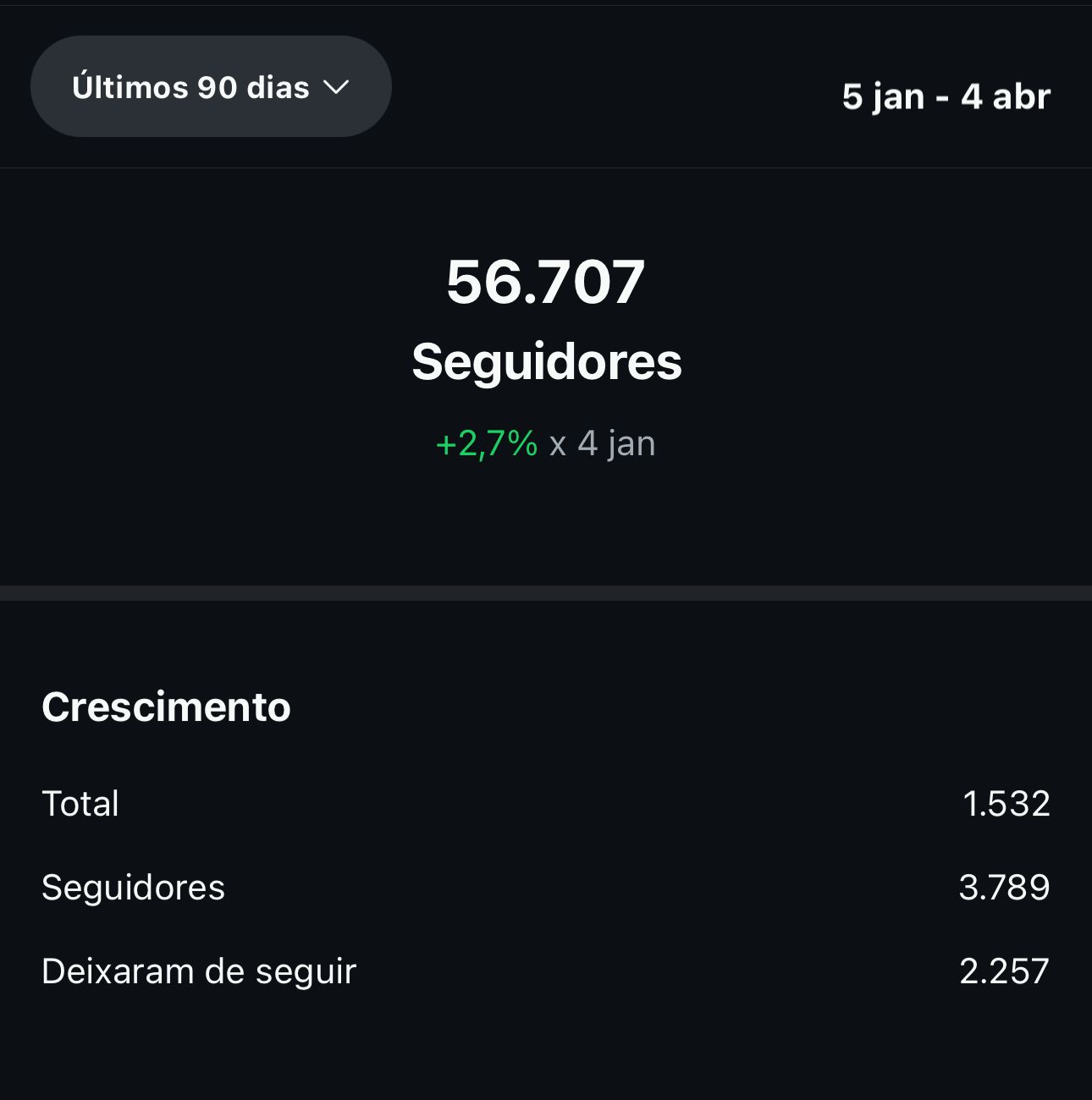 O perfil saiu de 52.918 para 56.707 seguidores em 90 dias — um aumento de 3.789 seguidores (+2,7%).